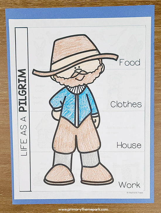 Sarah Morton’s Day or Samuel Eaton’s Day by Kate Waters are perfect books to read for learning more about life as a Pilgrim. Students display what they learned about Pilgrims with this cute lift-the-flap writing activity.
