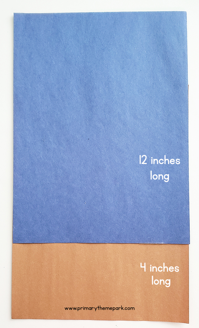 Turn a piece of brown construction paper into the portrait position. Cut it into thirds horizontally. Each cut piece will be four inches wide and nine inches long. Glue one of the pieces to the bottom of a piece of blue construction paper.